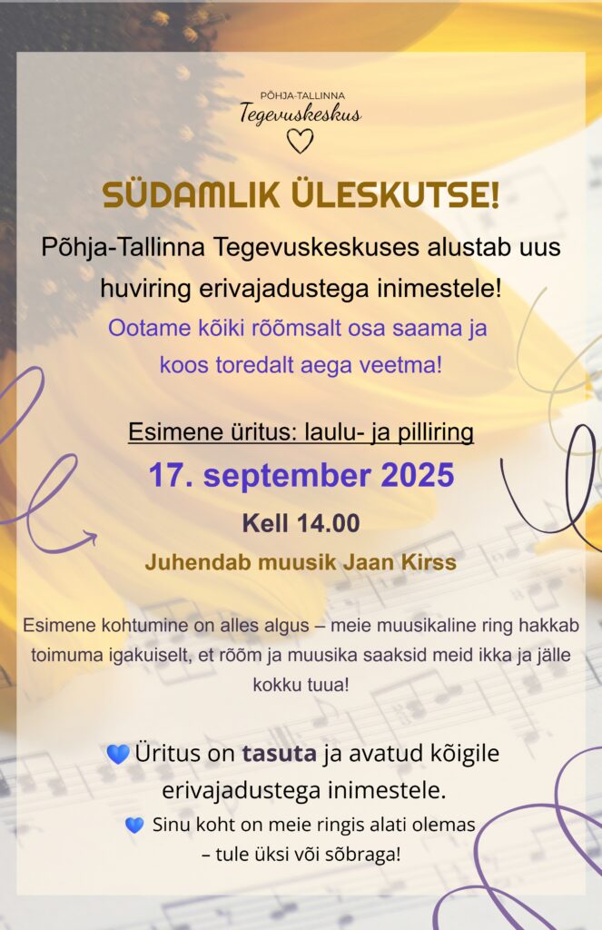 📍 Asukoht: Sõle 61a, Tallinn (Põhja-Tallinna Tegevuskeskus)📞 Kontakt: tiia-liis.jurgenson@ptsk.ee